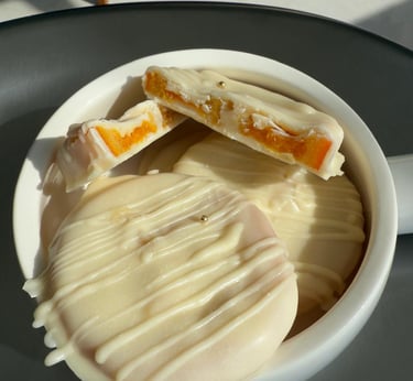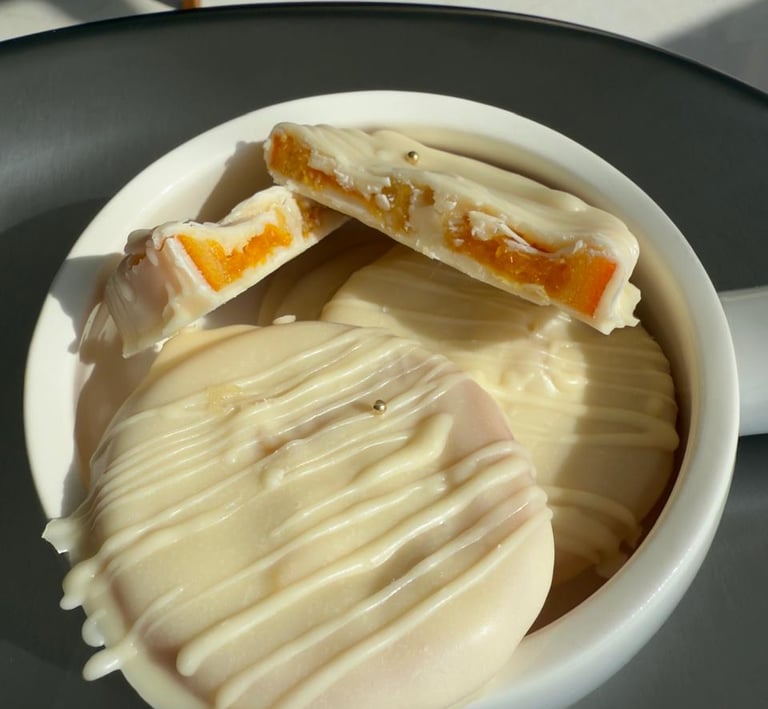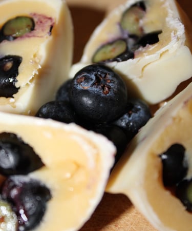 Arándanos frescos envueltos en brigadeiro y cubiertos con chocolate blanco, una combinación cremosa, dulce y frutal.