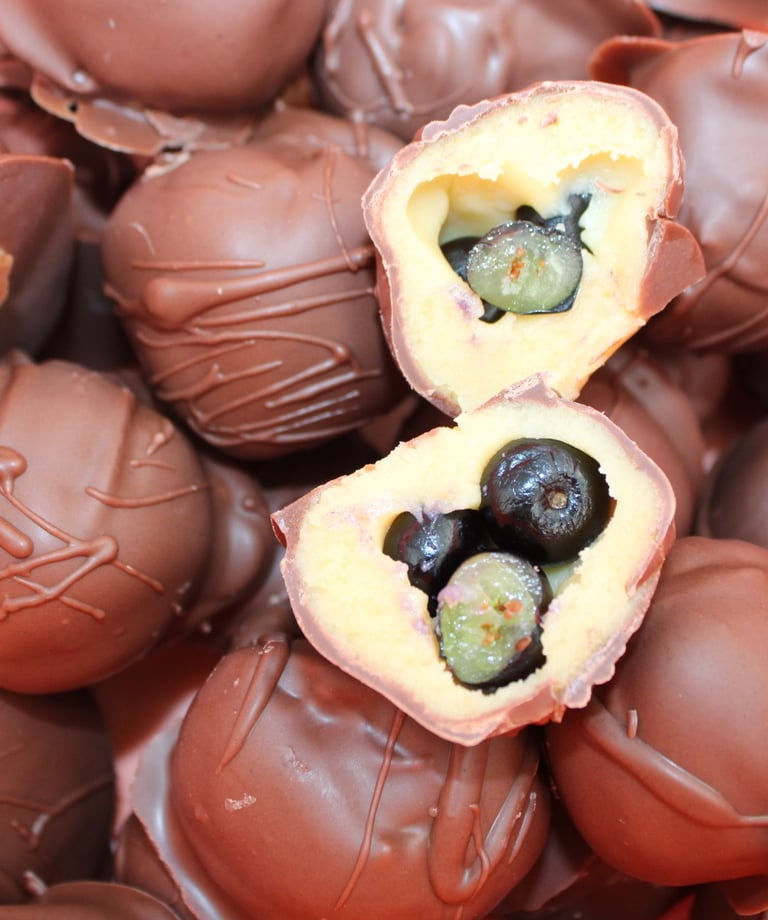 Arándanos envueltos en brigadeiro y cubiertos con chocolate con leche, creando un equilibrio perfecto entre fruta y chocolate.