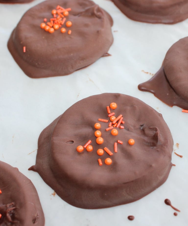 Galleta crujiente con mantequilla de maní y chocolate amargo.